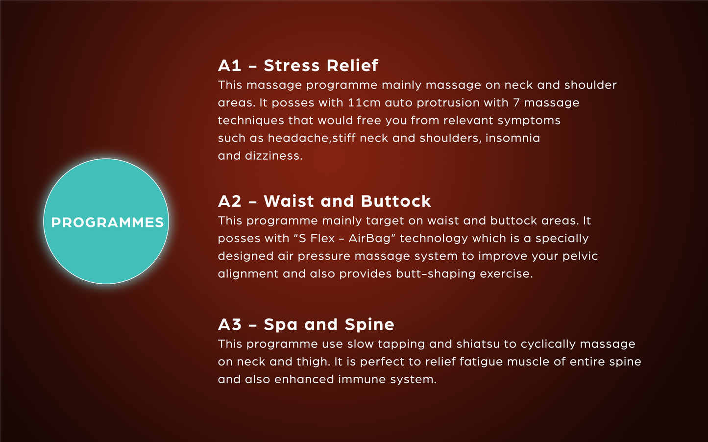 A2 – Waist & Buttock : focuses on waist & buttock using kneading & tapping, shiatsu,kneading simultaneously with its S-Flex airbag system that applies pressure for pelvic alignment & butt-shaping exercises,